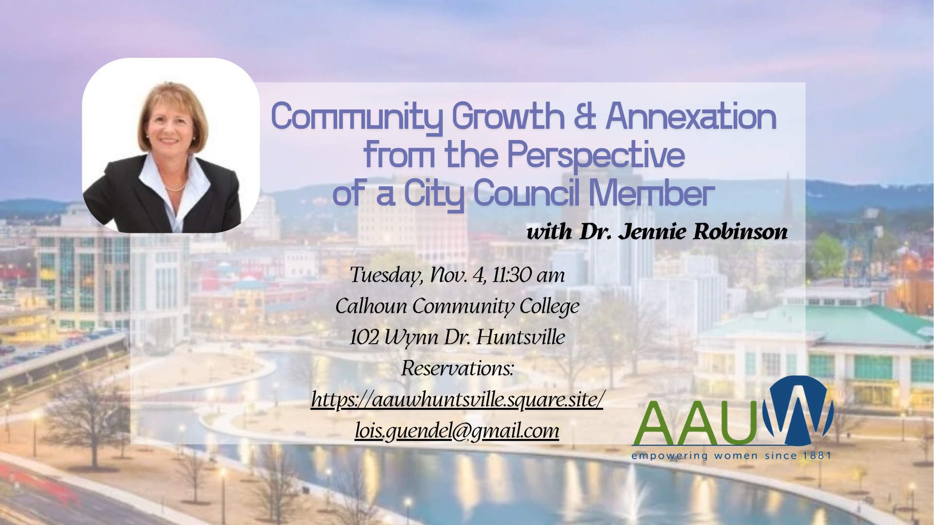 Join the American Association of University Women (AAUW) Tuesday, November 4, 11:30 am – 1:00 pm at Calhoun Community College for an interesting program about our community. Dr. Jennie Robinson, Huntsville City Councilwoman, District 3 will speak to the growth we’ve experienced and what’s coming in the future.